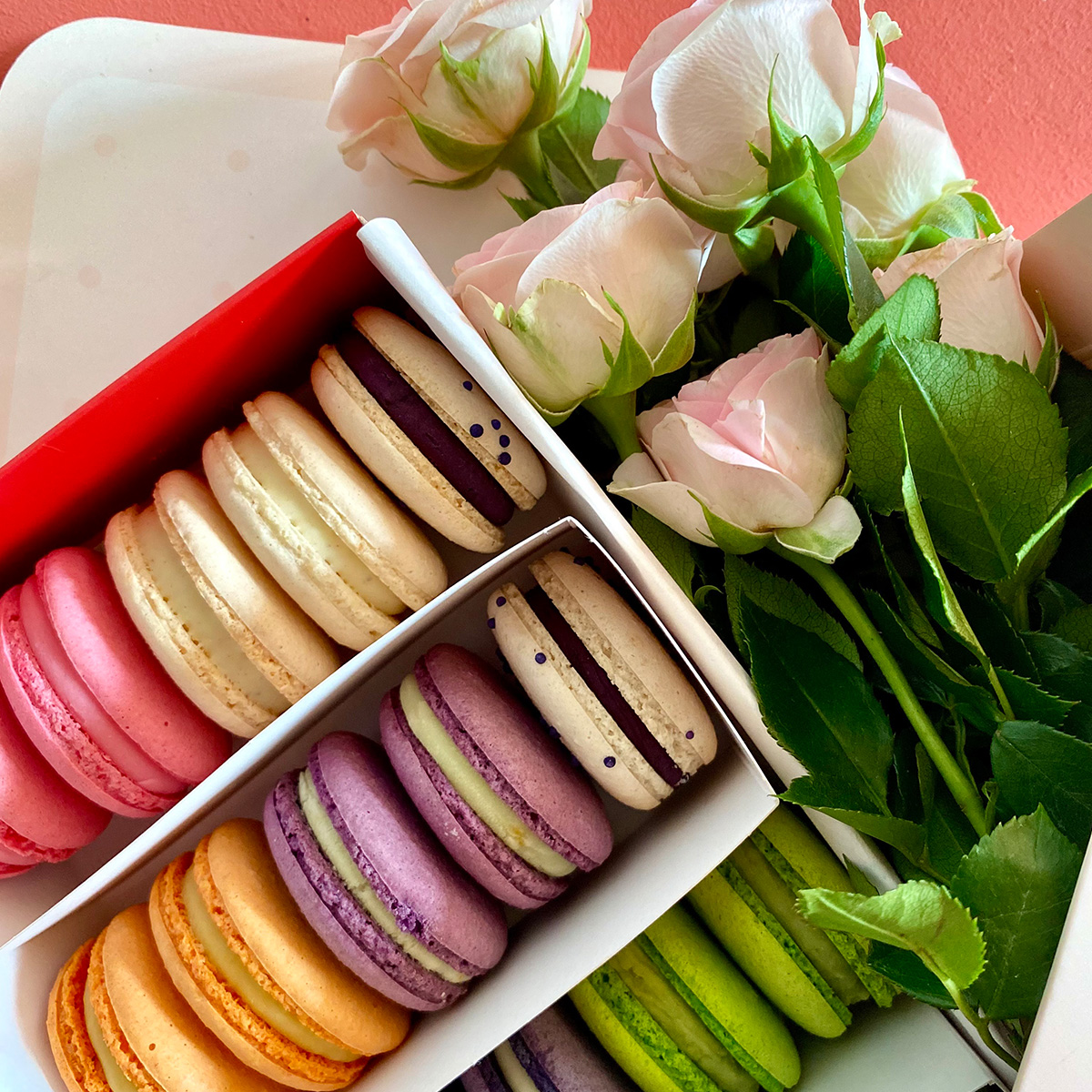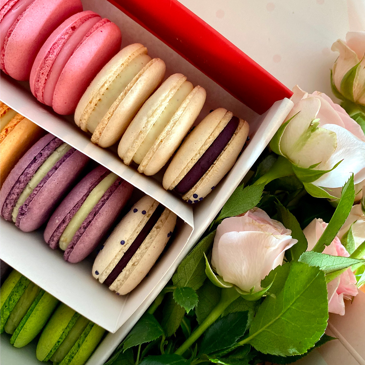 Подаръчна кутия с 16 или 20 френски макарони – безглутенови, приготвени с натурални съставки, истински плодове и подправки, с балансирани и изразени вкусове.