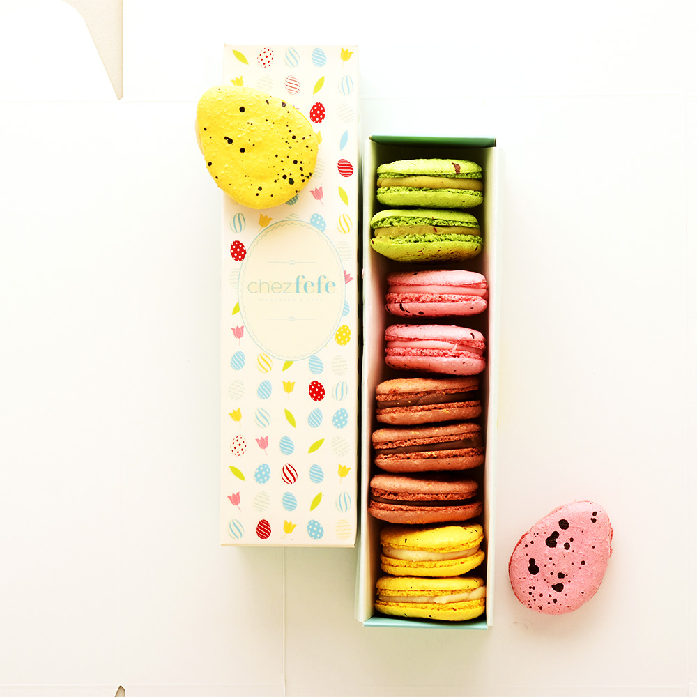 Jardin de Pâques е нашата авторска интерпретация на Великден. Селекция от 9 макарона-яйца, оформени изцяло на ръка в ателието на Chez Fefe. Тук класическата френска техника среща артистичното вдъхновение, за да превърне празника в сетивно преживяване.