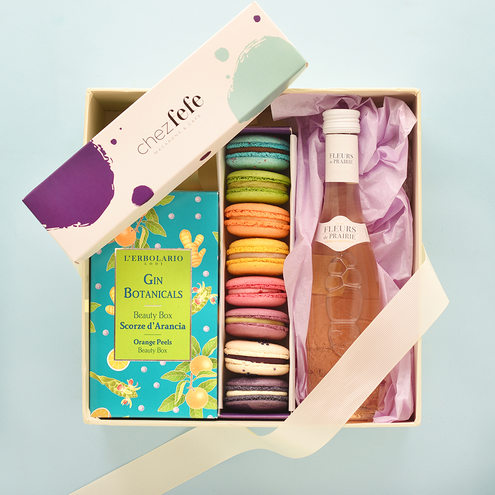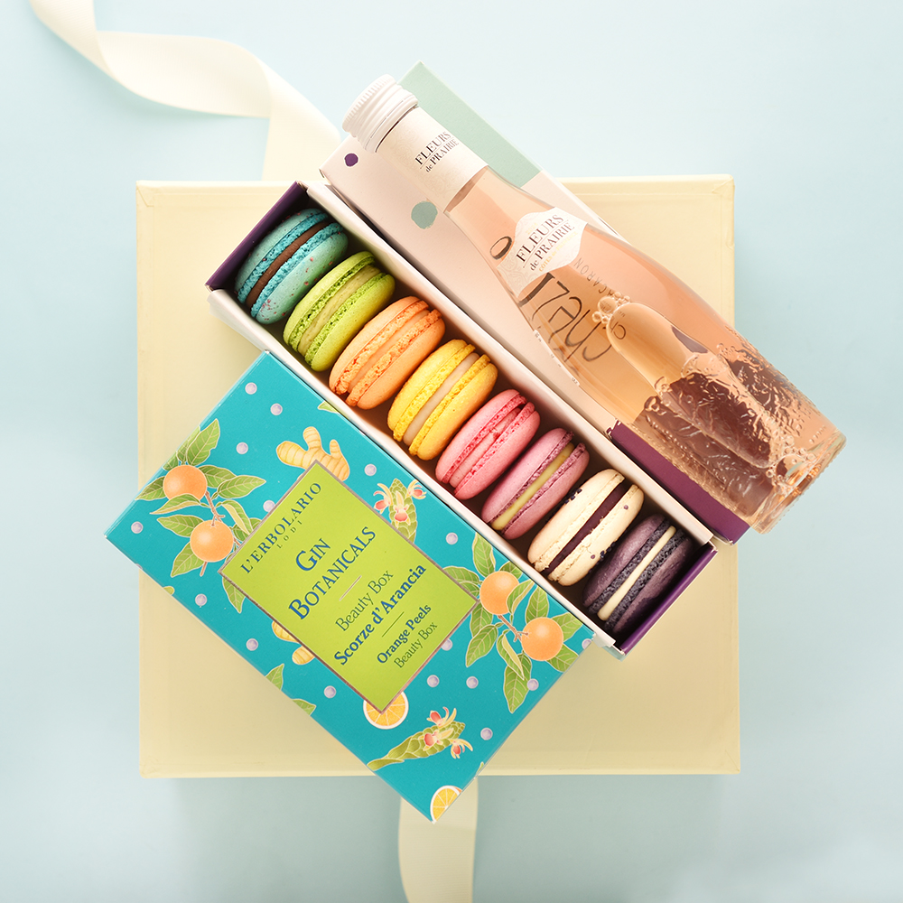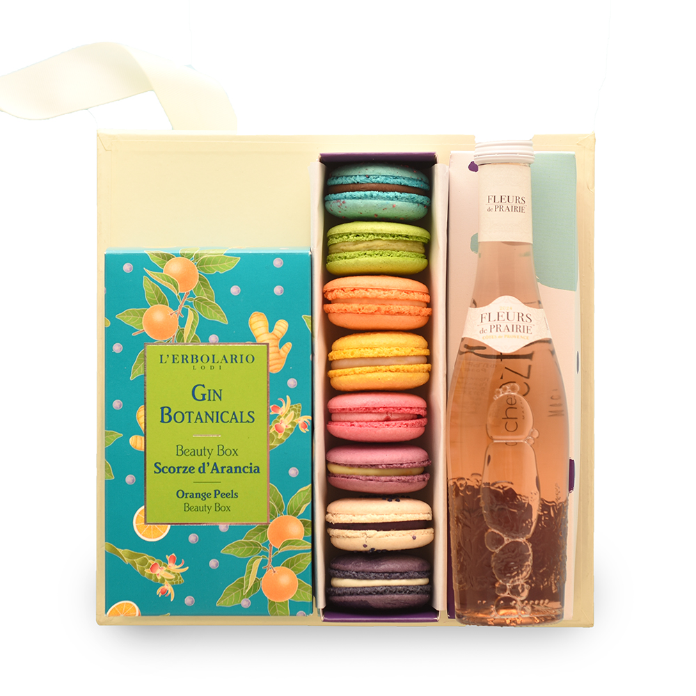 Подаръчен сет с френски макарони, spa botanicals на L’Erbolario и розе от Прованс (в избрани варианти).
