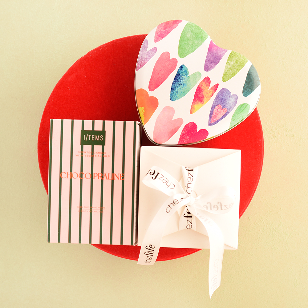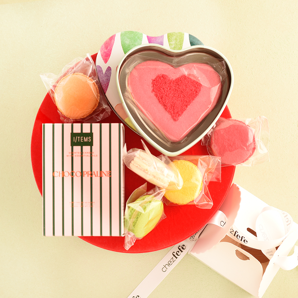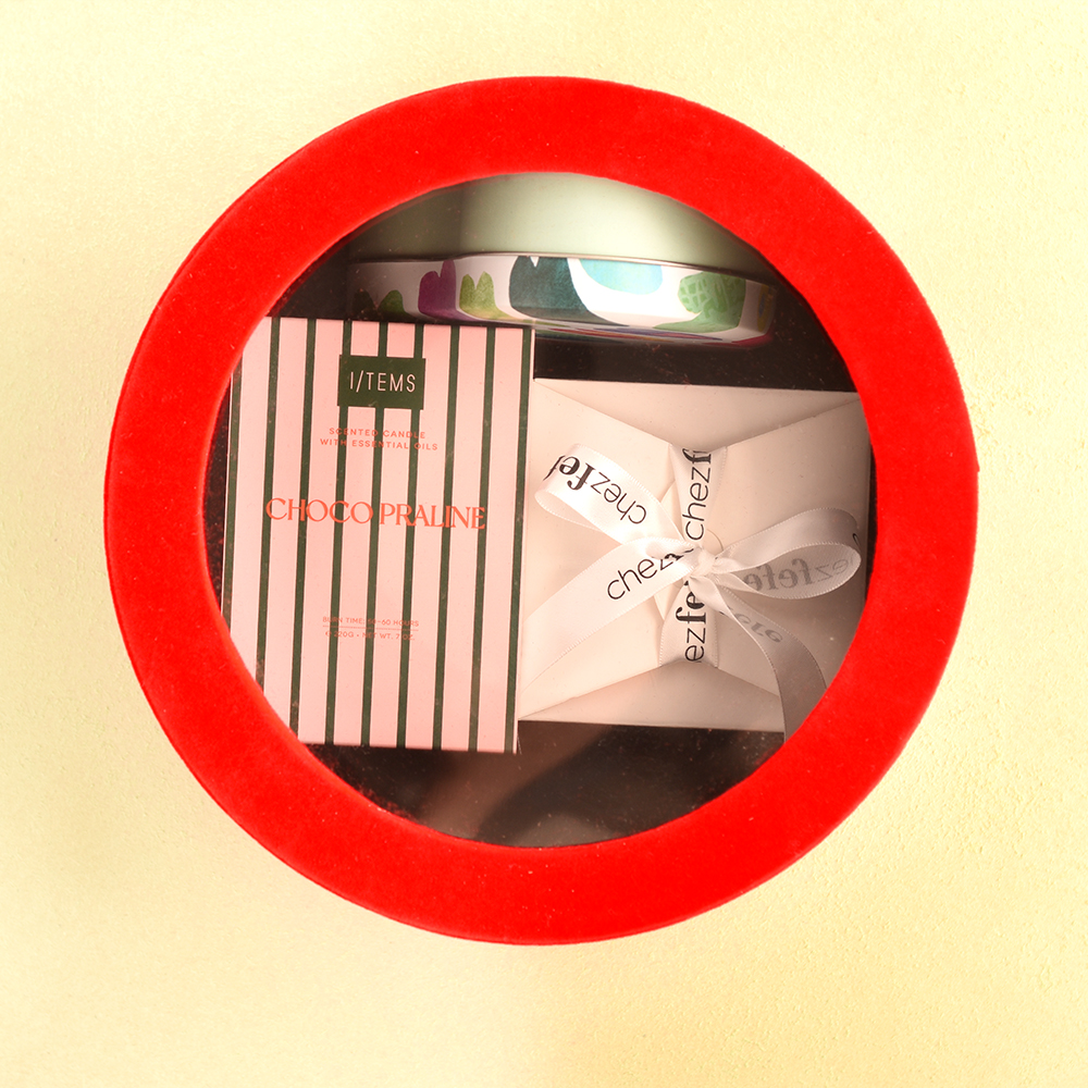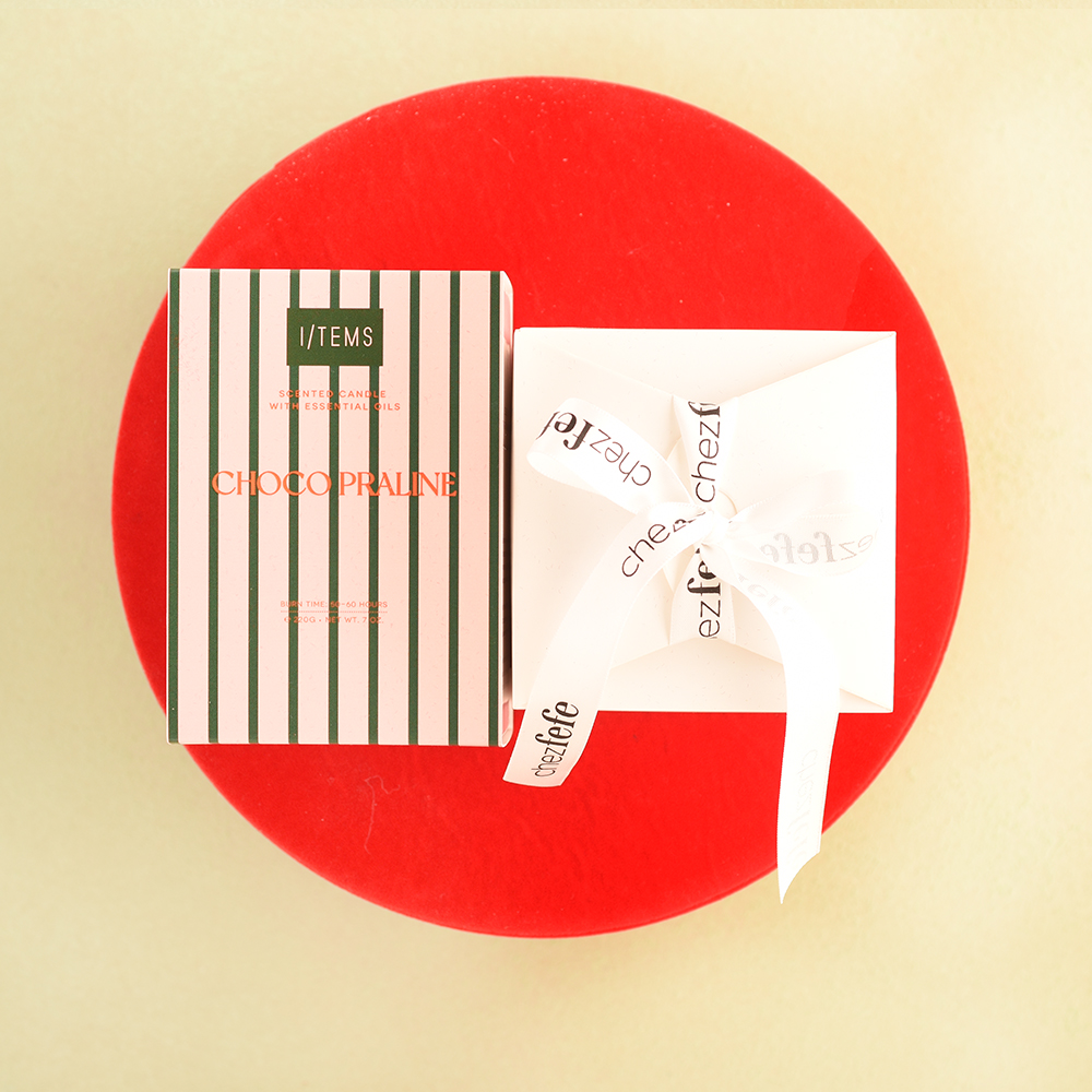 Съчетаваме вкус и атмосфера в един завършен сет, подходящ както за подарък, така и за личен повод – 6 френски макарона и ароматна свещ I/tems design, поднесени в кутия от червено кадифе с прозорец.